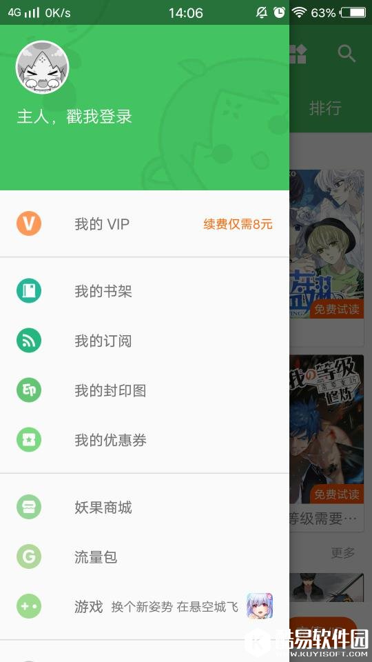 这款软件页面的功能是在屏幕上方,大部分软件应该都在下方的,这一个特色比较能让人记住。主要有四个主页面:推荐、VIP、订阅、排行,这些都是对于漫画书籍的分类。我的页面是隐藏的,通过往右滑屏幕就可以了,和我们使用的QQ比较类似。