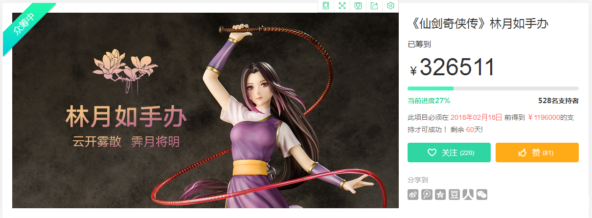 这款手办的售价是668元,这是官方的售价比较高,众筹售价为598元,这个众筹活动如果在明年的2月18日之前可以筹到1196000元的支持才能成功,现在的进度才只有27%,还有一大段距离,还剩60天,希望小伙伴们加油哦!