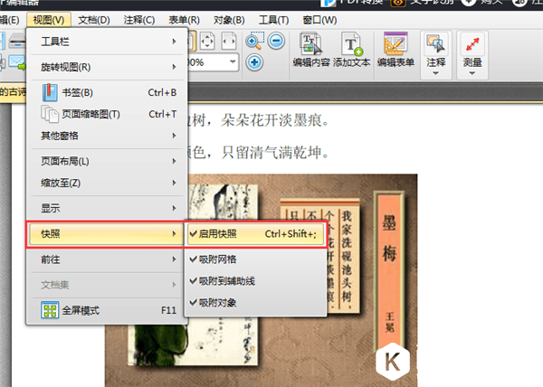 2、打开PDF文档以后,点击软件界面上方的【视图】选项,然后再点击里面的【快照】功能,将软件里的快照功能启动。
