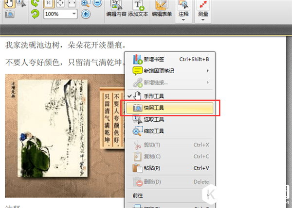3、快照功能启动之后,点击鼠标右键,然后选择【快照功能】,即可使用快照工具拍摄PDF页面,拍摄到想要拍照的页面之后,即可点击粘贴按钮,将拍摄的页面粘贴到Word文档。