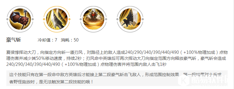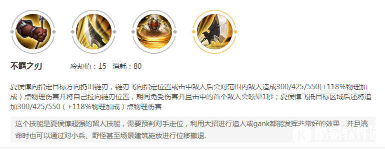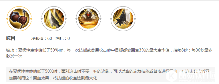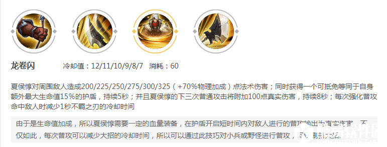 技能方面简述一下:被动就是低于50%的血量,普通攻击会回复血量,所以在血量低的时候不要怂,站撸下去谁输谁赢不一定。一技能没什么好说的,团战中一技能释放得好,可以提供不少的控制效果。二技能护盾虽然有点少,但是释放二技能过后的三次普通攻击会减少大招的时间,也附带真实伤害。所以夏侯惇一般都是大招起手比较多。大招是个位移技能,命中敌人还有眩晕效果。这个技能的伤害还是很高的,即使出的是肉装。