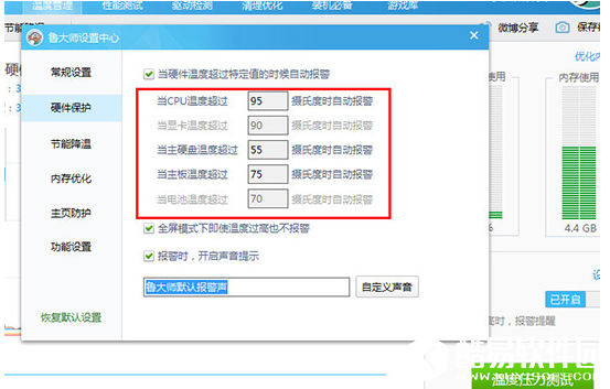 进入设置中心,小编已经用了红框进行标注,当此温度超过限定值时将会自动报警,一般来说,只要跟下图设置的温度值一样、就不会出现报警,如图: