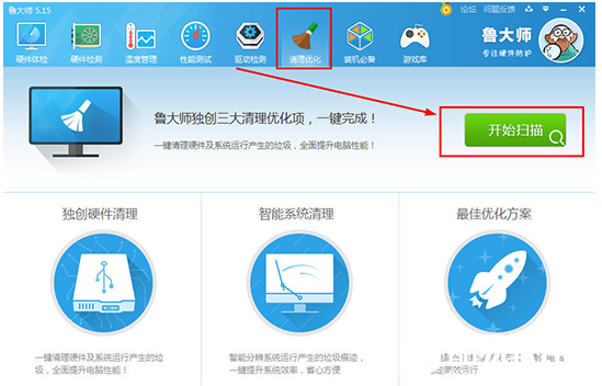 系统垃圾问题 电脑硬件及系统运行时产生的垃圾过多,也会导致温度过高,进入鲁大师的“清理优化”栏目,点击“开始扫描”,扫描结束之后就可以开始清理,清理完成,绝对能提高电脑运行速度,如图: