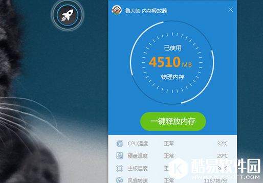 内存问题 使用鲁大师自带的“内存释放器”功能,一键施放内存,就可以解决内存过高所导致的温度问题,如图: