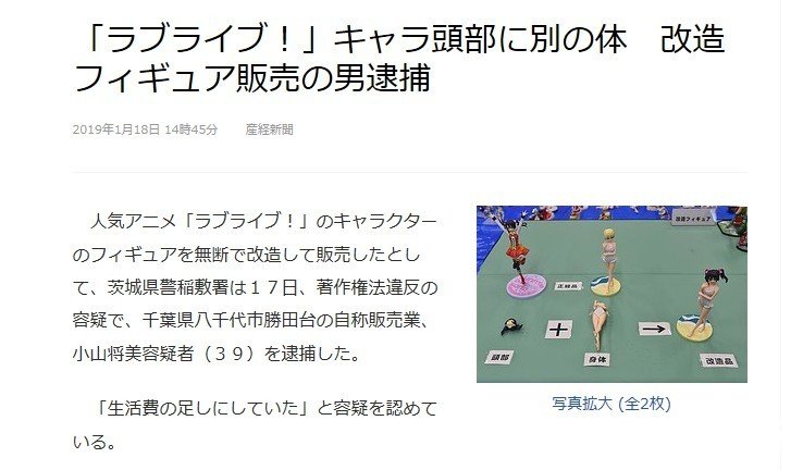 据了解,这位日本男子在2018年的9月将矢泽妮可(LoveLive)手办的头装在大吉岭(少女与战车)手办的身体上,并且在某平台上拍卖。被逮捕的同时,还将会调查他是否有其他的犯罪行为。下面是改造品图片: