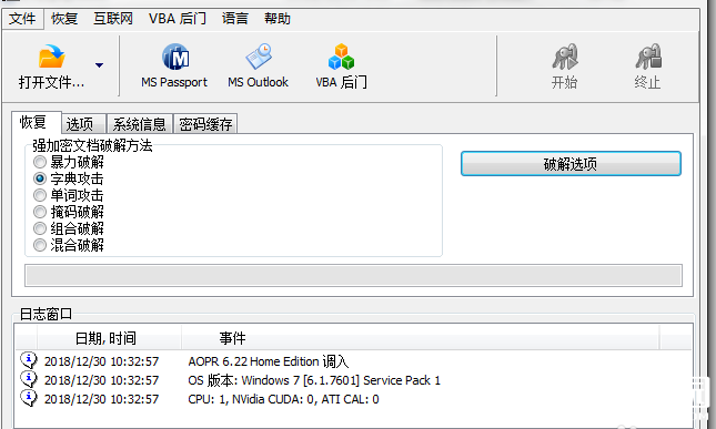 从网上下载了一份加密的Word文档,没有密码、无法打开文件,我们只能借助密码破解工具来帮忙。本文就以Advanced Office Password Recovery为例,软件提供了6种破解文档密码的方法,小编主要介绍“字典攻击”方法,请参考。 如何破解恢复Word加密文件的密码? 打开Advanced Office Password Recovery软件,进入主界面,点击“字典攻击”,