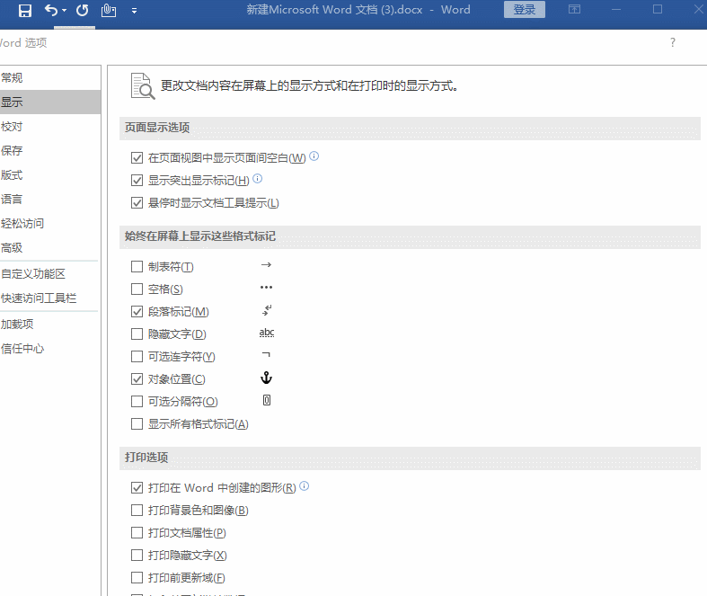打开Word文档,点击菜单栏中的【文件】——【选项】——【Word选项】——【显示】,