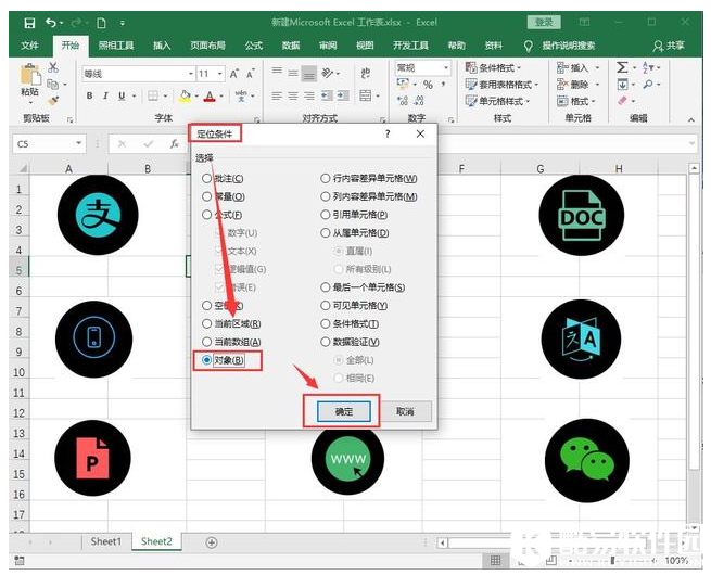 在“定位条件”中选择“对象”,点击“确定”即可,