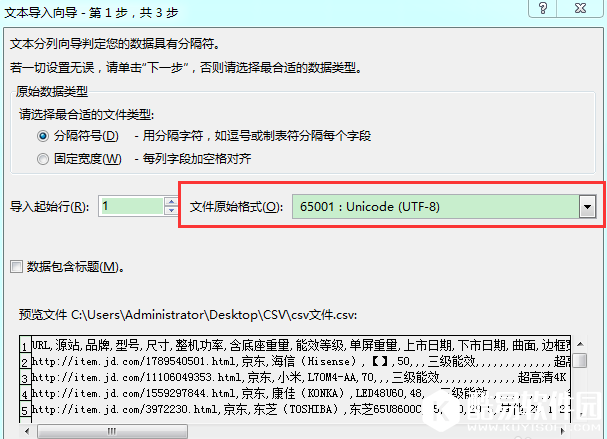 如果仍然乱码,点击“文件原始格式”,选择对应的编码格式,默认为65001;如果不行,可以在下拉框中尝试其他的编码,直到预览文件框里显示正确的数据。