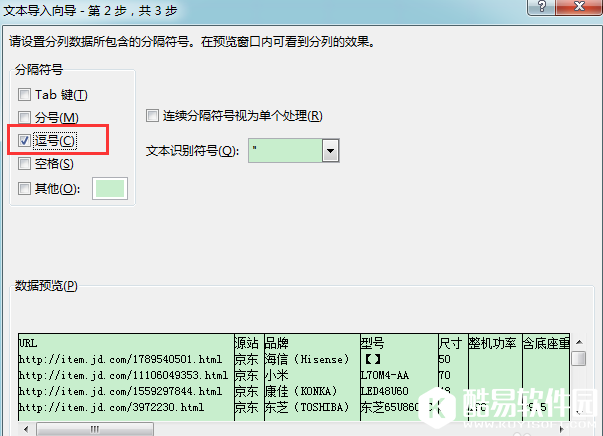 进行下一步,分割符号勾选“逗号”,在数据预览框中可以看到正确的分栏格式,点击“完成”,