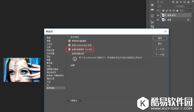 按住快捷键【ctrl+J】来复制图层,打开菜单栏的编辑——首选项——技术预览,勾选“保留细节2.0”,点击确定,