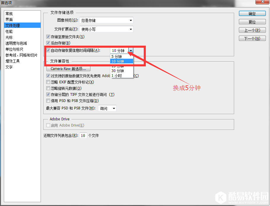 2、完成第一步之后,会弹出一个对话框,将【自动存储恢复信息时间间隔(A)】的时间更换成5分钟,默认是10分钟。