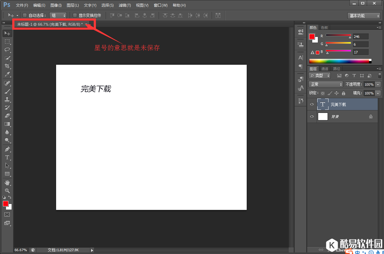4、可以看到新建的文档后面有个星号,这代表未保存。