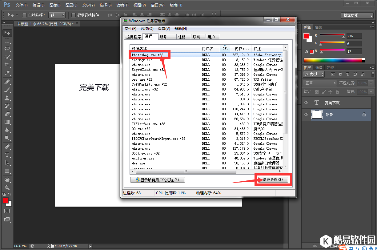5、看着时间,5分钟应该很快会过去。然后打开电脑资源管理器,结束PS进程。这样做的目的是假装PS又出问题了。