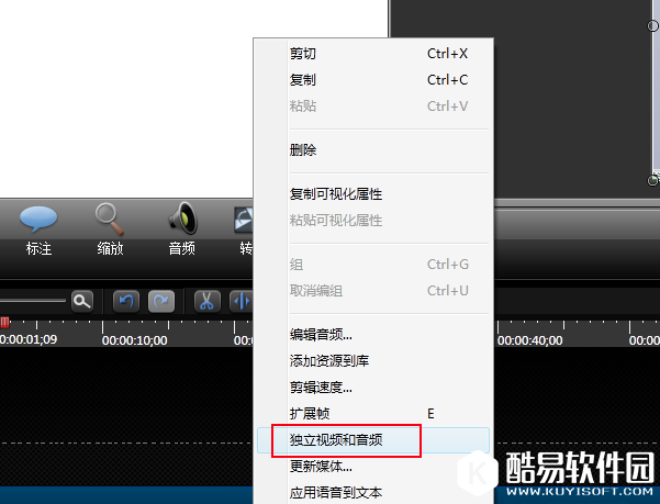 选中视频,点按鼠标右键,选择“独立视频和音频”,