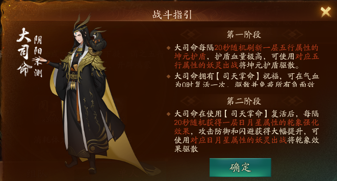 天开于子大司命的副本机制,有点类似之前的某个合作本,也是会刷新随机属性的五行护盾,然后对应的五行妖灵出战就可以解除。不过之前的护盾盾量很一般,永动多动几次就没了,这里的五行护盾上千万的盾量只能老老实实用对应的妖灵解了。 同时大司命有两条命,进入第二条命之后,没有盾了,但是每隔20秒会根据日月星属性大幅度提升闪避,只有用对应的日月星妖灵出战才能解除也就是才能命中大司命。 单刷阵容的话,高阶转灵小月和高阶星伯或者大司命必须要有一个必须要有一个: