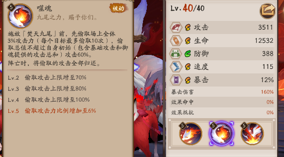 被动就很强了,是一个可以投攻击的式神。玉藻前在释放大招前,会偷取场上全体,即敌方和我们全体单位最多6%的攻击力,这个效果跨回合时消失,进进入P2P3重新偷,如果一轮进入持续战斗不能一轮,则每个目标最多被大舅妈偷取10次攻击。 偷取攻击上限最多不超过玉藻前攻击面板的100%,这里的攻击面板是式神录中玉藻前基础攻击和御魂加成攻击的总和,毕竟进入魂土后,可能会因为各种buff式神增加攻击。
