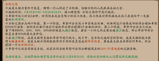 在阴阳师日轮之城活动进入第四天后,开启了日轮之陨,这个活动相当于一个小退治,不过没有排名划分,只有按伤害分奖励。