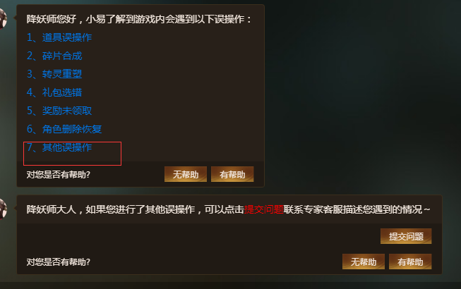 然后跳出来的选择中继续选择误操作,之后就可以向客服提交恢复申请了,客服处理完毕后会发送邮件告知,重新登录游戏即可看到被恢复的妖灵。