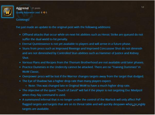 这是最近《魔兽世界》社区经理Aggrend“非Bug”列表内容进行的更新,这里比较明确的说明 了一些被玩家认为是“Bug”但事实上并非Bug的内容,希望大家可以留意。 |