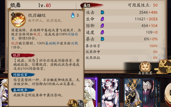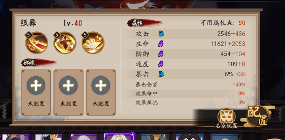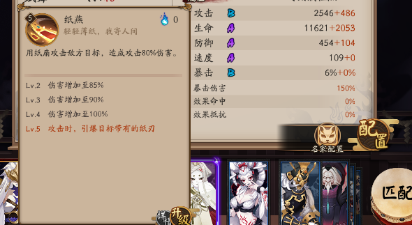 作为一个纯输出,攻击只有B+,让人想起了灯姐,速度只有109,初始暴击只有6%,不过暴击都不是问题,毕竟除了SSR,多少间接伤害式神的初始暴击都蛮低的。 关于纸舞的御魂: