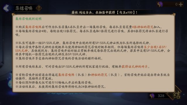 在召唤开始前,队长可以选择一组(六个)SSR/SP式神加入卡池,出货概率和平时无UP抽卡相等,集结组队召唤如果正好碰上概率UP活动,则不享受其他活动的概率UP加成。该次召唤必定出现一只所选的SSR/SP的式神(48抽必得指定的六个式神之一),且SSR和SP的卡池中也只有这六位。但是出货后,将由抽出该式神的玩家持有,即花费328开启抽卡的队长很可能不出货,给他人做嫁衣。