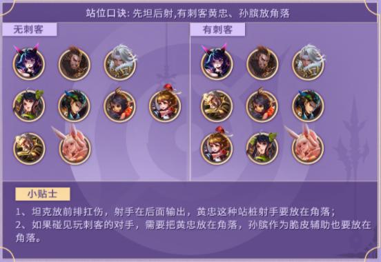 射手阵容的常规站位是“龟甲阵”,坦克前排,射手龟缩在后方输出。程咬金保留了大招回血,扛伤能力很猛,更别说还有个“双抬血”的加持,钟无艳则可以开启大招石化,给射手增加更多的输出时间。 面对刺客阵容的时候,因为刺客会跳到后排输出,所以这时候提前把坦克放在最后面,把射手放在中间的位置。