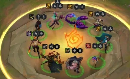 首先是棋盘的变化,从以往的6x7增加至8x7,也就是双方各4x7的棋盘。棋盘的扩张可以使棋子的摆放具有更大的策略性,但同时又通过元素格的设定来给玩家一些棋子摆放的限制。 那这个元素格是什么呢?在每局游戏的开始时会确定这一局游戏的元素格是什么元素,可以通过选秀圈中心来确定这一把是什么元素,如下图显示的火焰就意味着这一局确定的元素是炼狱。 炼狱元素的效果是在格子上的英雄在对决开始时+30%攻击速度,除了炼狱,还有海洋为对决开始时+30法力值,风为+30%闪避概率,山脉则为每回合+30永久最大生命值,可一直叠加,即便移出元素格也不会被重置。