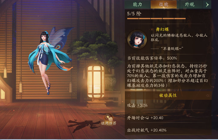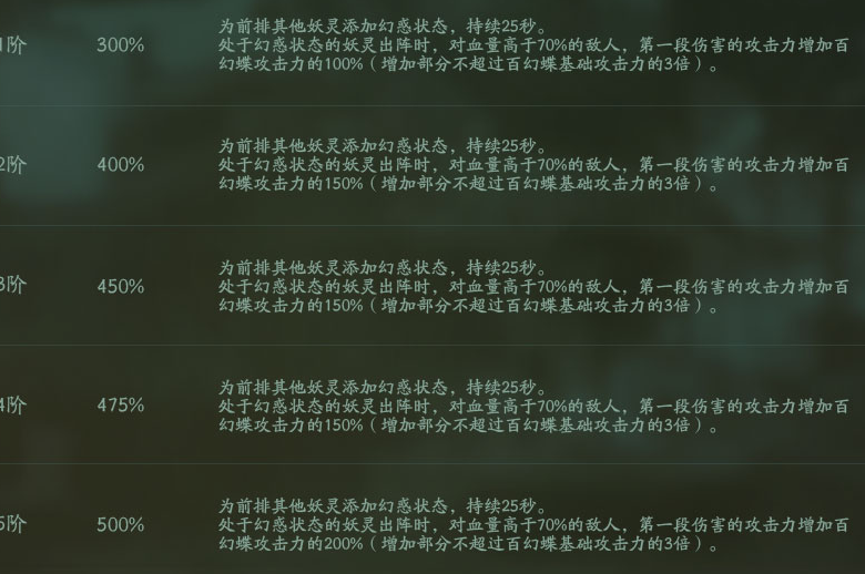 百幻蝶的技能是为其他两个前排队友附加25S的幻惑状态,因此放出技能后可以直接用灵宝换掉。在幻惑状态的持续期间内,前排两个队友队友血量在70%以上的单位,第一段伤害攻击附加百幻蝶攻击的200%。但是不超过百幻蝶攻击力的三倍。 70百幻蝶基础攻击只有4463,灵契加成1000,被动加成30%,不考虑其他情况5阶满被动一百幻蝶可以为输出增加7101的攻击力,但是仅限第一段伤害,并且只在70%以上血量生效。 因此阿织多段流直接扑街,段数越少的妖灵受益越大,首当其冲的就是只有莎莉丝、茨木,夕辉以及同期的SSR灶神这种攻击一段的妖灵了,伤害更加爆炸了,因此算是一个不错的平民辅助。 如果是为了爬塔竞速上榜的话,普通玩家还是可以抽一抽5阶的,其他场合就业面也就那样吧,高难本的例如鸿蒙讲究的是持久战,活动刷榜本是重氪大佬竞争的舞台,和普通人没啥关系。 当然大佬肯定是无视一切抽灶神顺便五阶的。