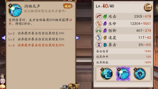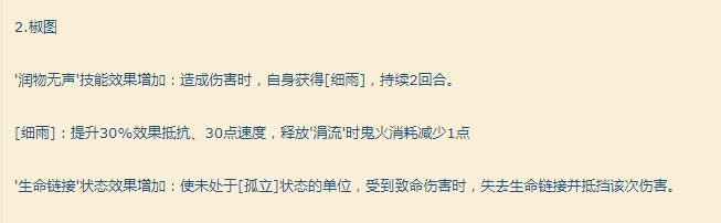 被动新增效果:当然椒图造成伤害时,自身获得两回合的细雨效果