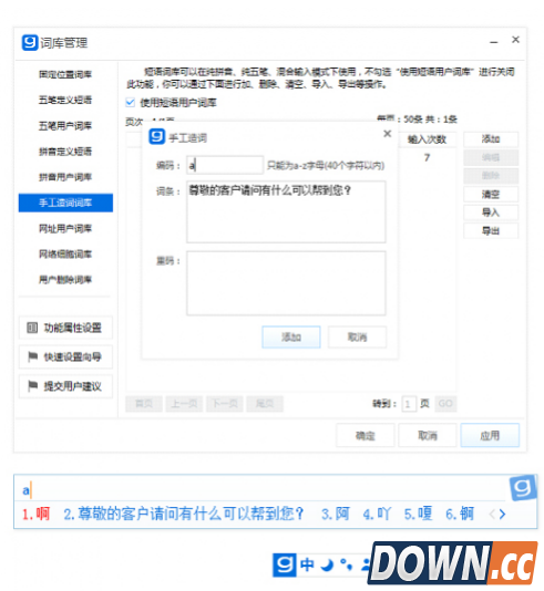 进入该界面后,点击“添加”,在词条框内输入想要设定的词句,在编码框内输入自己想要设定的编码,点击“添加”确认后,输入字母“a”,就能打出刚设定的长句。