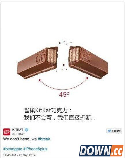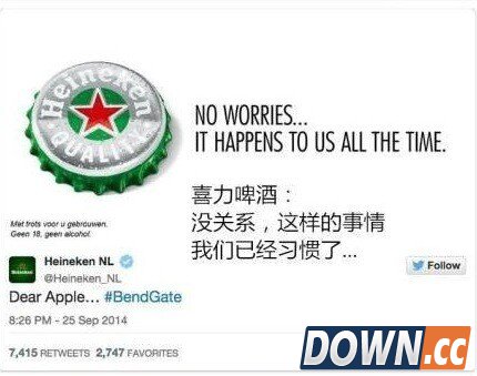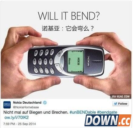 网友恶搞各个品牌也来踩一脚。 不少科技界人士也表示,虽然iPhone 6 plus 可弯曲看起来像一个笑话,但是即便弯了还没有坏,换别的手机,说不定就不能用了呢。话说回来,曲面手机,本来就是一个时尚话题。虽然iPhone 6 plus 弯曲的有些意外,可这让专注做曲面手机的LG,情何以堪啊?