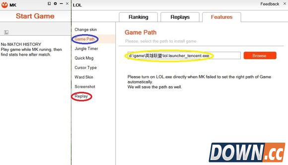 蓝色圈圈为设置游戏路径,黄色圈圈里应该为你的英雄联盟客户端路径,红色圈圈为录像功能,建议关掉。