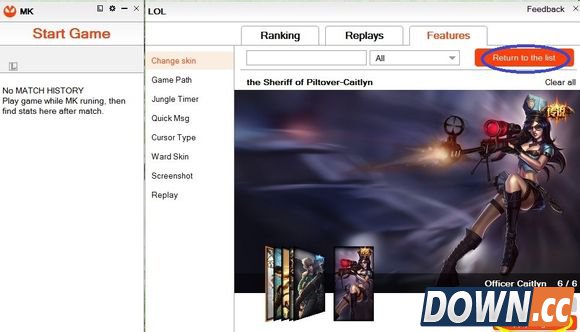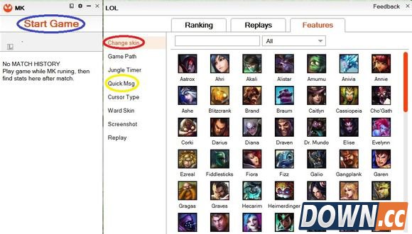 登录后的界面,蓝色圈圈为启动游戏,红色圈圈里是换肤功能,黄色圈圈设置快捷喊话,T为快捷键。
