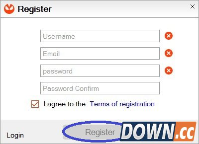 这是注册界面,第一行用户名,第二行邮箱,第三、四行是密码,填完后点击蓝色圈圈的注册,之后去邮箱确认链接即可完成注册激活。