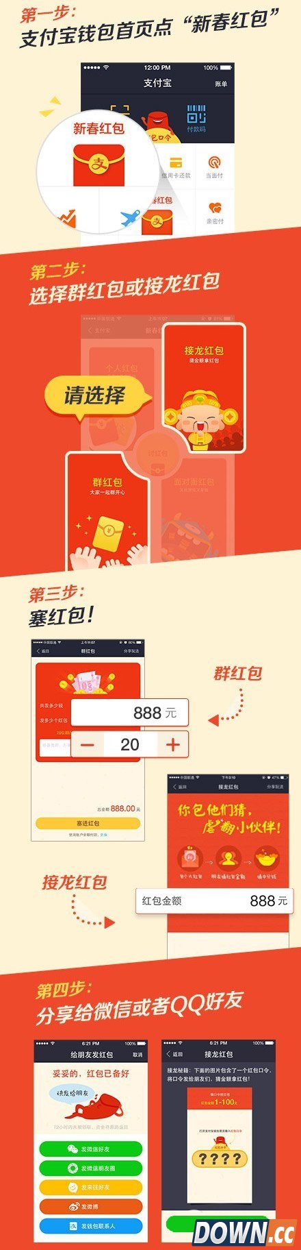 支付宝钱包红包口令怎么发的具体步骤大家请看上图哦~ 支付宝红包推出了“红包口令”功能,简单点说就是,当用户将红包分享到微信或QQ时,支付宝红包会自动生成一张带有数字口令的图片,用户点击“保存图片并打开微信”就可以将这张图片保存到手机相册中,并打开微信。 此外,这张图片可以任意发到微信群、朋友圈或者QQ中,收红包的人只要看到这张图片,记住图上的数字口令,再进入支付宝钱包首页,点击“红包口令”输入这串数字,就可以领取红包。 |