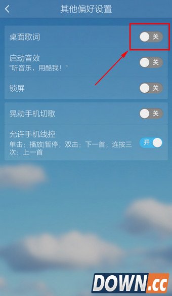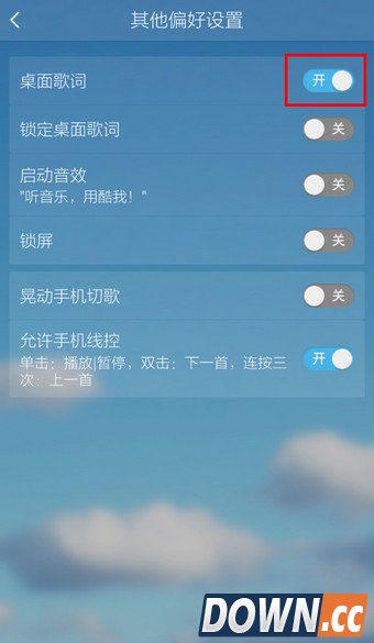 5.按钮变为蓝色【开】表示已打开桌面歌词