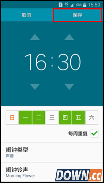 4.设定您需要的闹钟时间、重复日期等相关参数,然后点击屏幕右上角的【保存】。