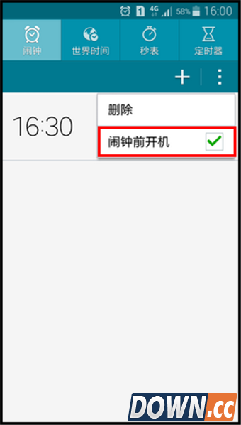 5.点击屏幕右上角的【菜单】键,将【闹钟前开机】打钩即可。