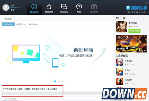 5.启动或关闭游戏时较慢 此现象目前正常,因为在启动或关闭游戏时需要启动或关闭模拟器,占用CPU资源较多,官方已经在改善中。 6. 模拟器下载没有进度