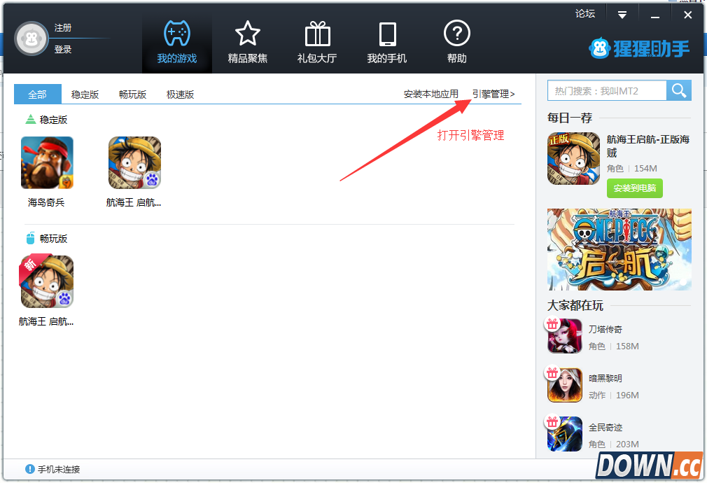 安卓游戏如何实现多开呢?猩猩助手3.0最新版本可以设置游戏多开,帮助安卓游戏玩家们多开游戏,同时开两个号进行游戏,一起来学习一下吧 猩猩助手游戏多开教程: 1、打开猩猩助手3.0,根据下图的位置打开引擎管理: