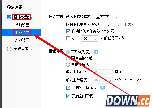3、在设置界面左侧,打开“基本设置”下面的“下载设置”