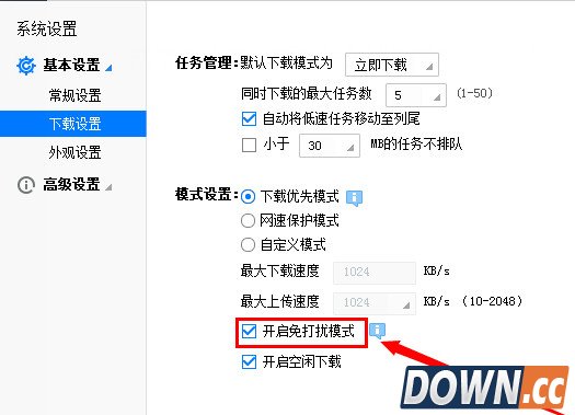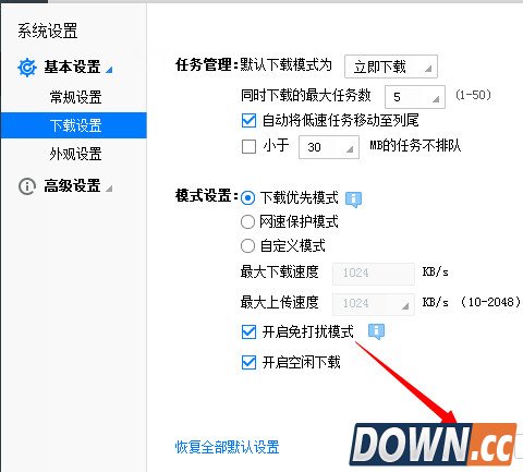 4、在任务默认设置面板里面买可以看到“模式设置”里面的“开启免打扰模式”,勾选即可设置好“开启免打扰模式”后,点击迅雷下载设置界面右下角的“应用”按钮即可完成下载完成开启免打扰模式的设置