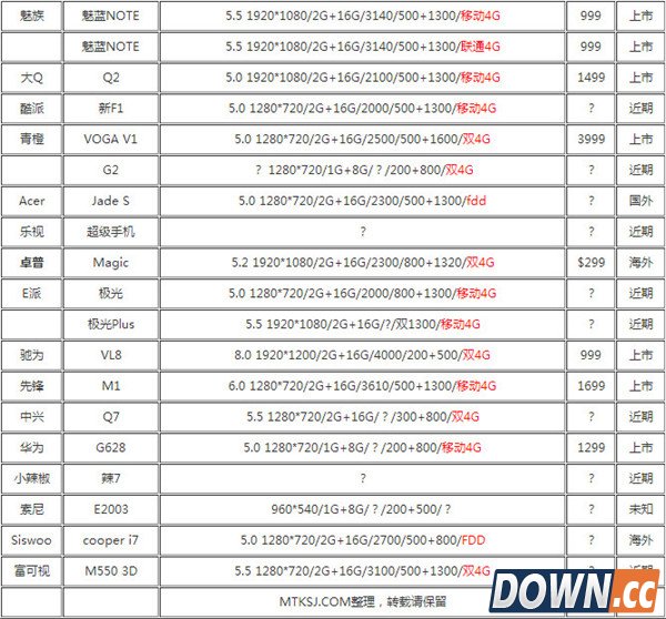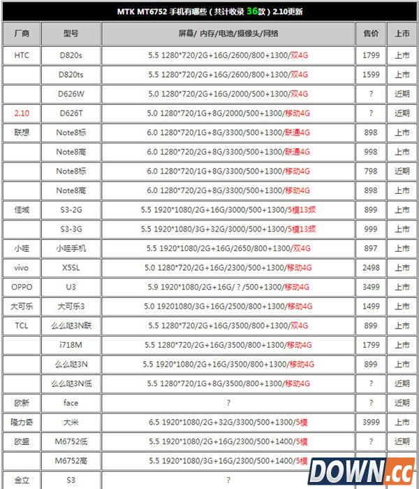 MTK MT6752的图形处理器也同样出自于ARM,整合的Mali-T760拥有强大的多媒体性能,支持1080P H.265硬解以及H.264 1080P视频录制,能支持16MP相机(内置双ISP)和1080P屏幕,集成的LTE MODEM同样支持CAT4,兼容FDD/TDD-LTE/HSPA+/TD-SCDMA/GSM网络,最重要的升级是能够支持64位系统,与MT6732针脚兼容。(MT6752详细规格) 内置MT6752的终端产品将于本季度正式上市,TCL等与联发科合作密切的厂商将推出MTK6752产品,同时也有HTC等一线厂商。以下数据来源网络,不排除官方会有改动,如有错误欢迎指正,爆料: