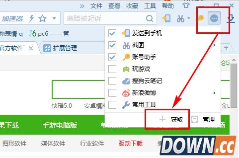 1、打开搜狗浏览器点击更多扩展,点击获取