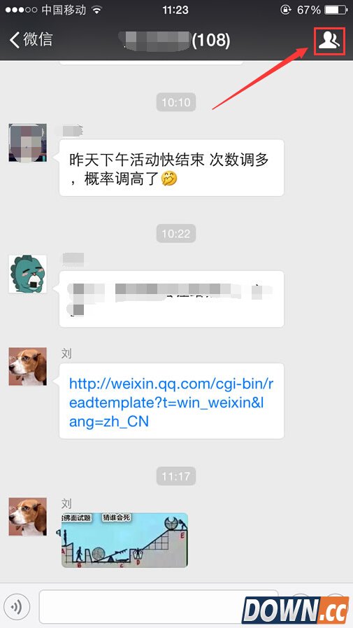 2.点击微信群进入聊天页面后,再次点击页面右上角像小人头像的按钮,进入群设置页面