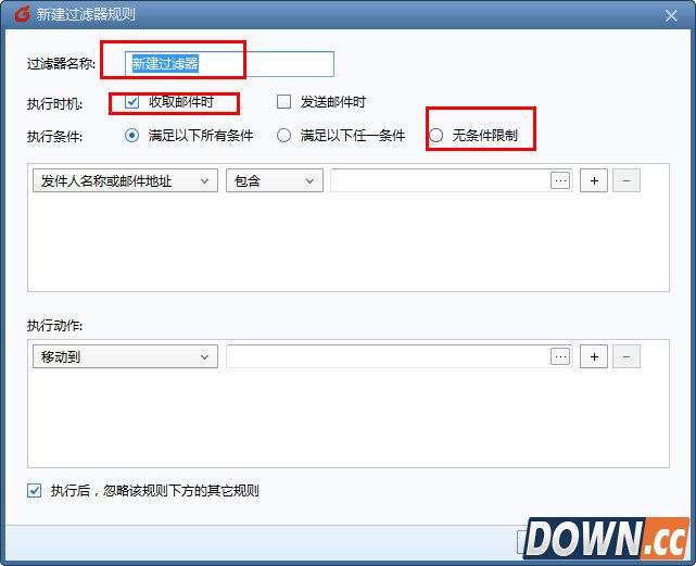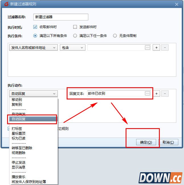 3、接下来,我们就来设置自动回复的过滤器的规则。设置名称,设定自己喜欢的名字就可以。执行时间,一般设定为“收取邮件时”对于执行条件,自动回复,我们一般对所以邮件都进行回复,所以选择最后一项。如果你需要对特定的邮件特定的回复,就可以设置相关的条件,自由组合自定义内容,非常方便。