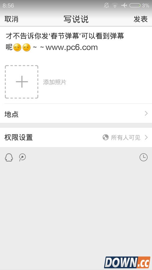 第二步:在说说界面输入带有“春节弹幕”、“qq空间更好玩”等关键词的说说,点击发表,就可以看到全屏弹幕啦。