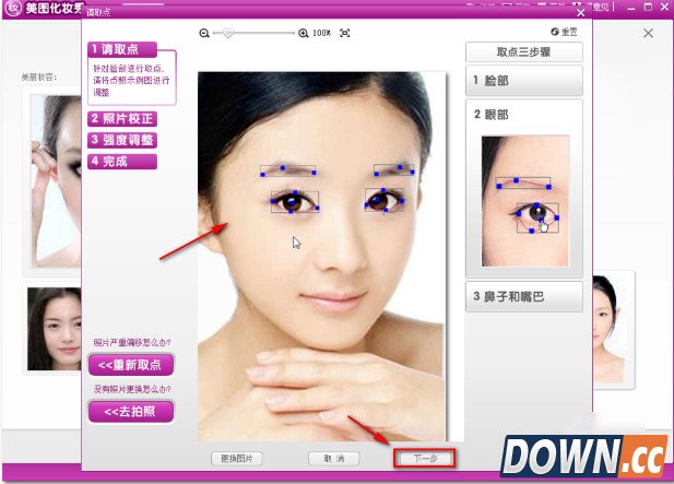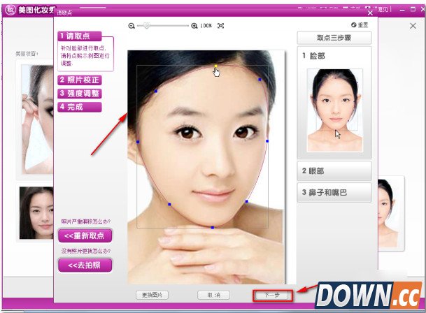 2、在弹出的窗口中需要三步,调整脸部,眼部,鼻子和嘴巴,调整一下。调整好脸部以后单击下一步