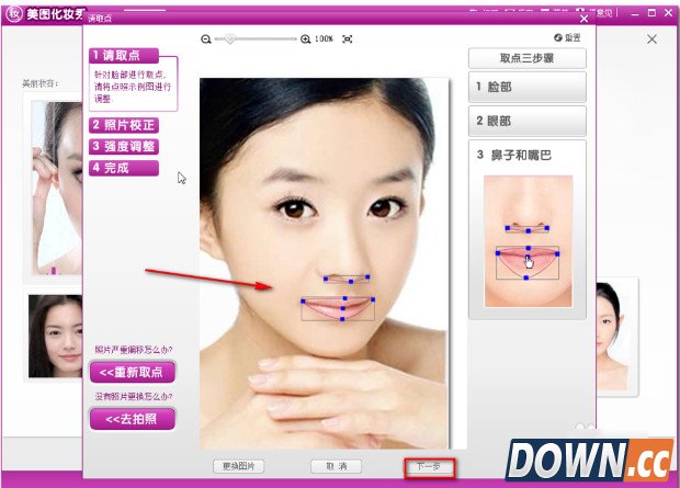 4、在弹出的窗口中在调整一下鼻子和嘴巴,调整完成以后单击下一步